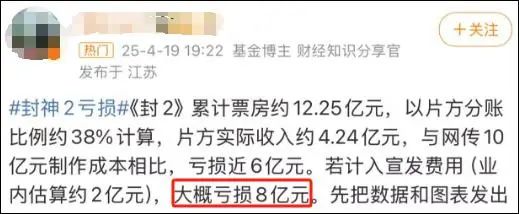 据媒体报道,4月19日,“封神2亏损”话题冲上热搜第二,引发热议。